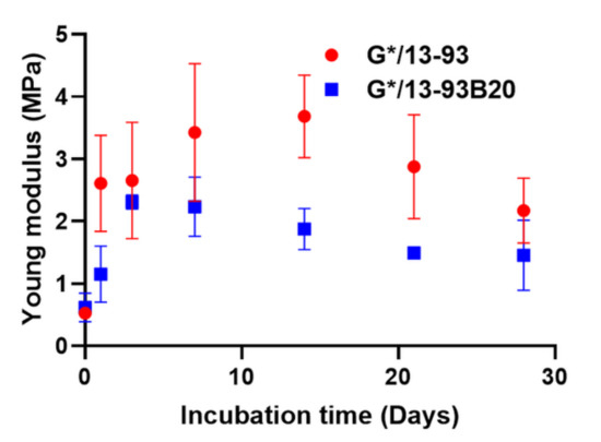 Young’s modulus was measured on wet samples as a function of incubation time (Figure 5). The evolution of the mechanical properties takes place in two stages. First, an increase in Young modulus for both hybrids can be seen. A maximum is then reached at 3 days for G*/13-93B20 and at 14 days for G*/13-93. At longer immersion times, a decrease in Young’s modulus is noticed. The increase in modulus could be due to the syneresis phenomenon, as explained for Figure 2. The water loss leads to a reinforcement of the mechanical properties. After that, the decrease in Young’s modulus would be due to hybrids erosion, inducing a loss of its mechanical properties. This corroborates the phenomenon showed in Figure 3 and Figure 4, showing that this decrease happens when the stabilization of ion release is reached for G*/13-93.
