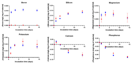 As postulated by L.L. Hench, the ability of a material to induce precipitation of an hydroxyapatite layer at its surface can be considered as a sign of bioactivity [11]. Immersion in SBF was conducted for two weeks, and the solution was not refreshed. The ion concentration in the solution was quantified. The difference between the ion concentration in SBF and ion concentration after hybrid immersion was calculated (Figure 6).