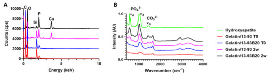 After 2 weeks of immersion in SBF, nodules appeared at their surface. The nodules are small and dispersed on the hybrid containing 13-93, while they are more numerous and larger on the G*/13-93B20 hybrid surface. EDX analysis were performed on the nodules shown in Figure 8, and the spectra are presented in Figure 9A. The composition of the spheres from both hybrids is mainly Ca and P with a ratio of Ca/P of 1.77 ± 0.08, which is close to hydroxyapatite [33]. This corroborates the precipitation of the calcium-phosphate layer hypothesized from the ICP analysis (Figure 6) and confirms that these nodules are probably apatite nodules. It is interesting to point out that the materials containing the glass 13-93B20 exhibit a higher population and bigger nodules than materials processed with the glass 13-93. This is in agreement with Huang et al., who demonstrated that the borosilicate bioactive glasses convert to HA faster and more completely than their silicate counterpart [34].