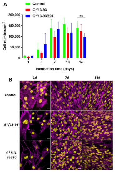 (A) Proliferation of MC3T3-E1 cells cultured in α-Minimum Essential Media (α-MEM) complete medium on Tissue Culture Polystyrene (TCPS), G*/13-93, and G*/13-93B20 hybrids for 14 days, analyzed by a CyQUANT Cell Proliferation Assay kit. The number of cells was normalized with the area of the materials surface (** p < 0.01). (B) Morphology of MC3T3-E1 cells in αMEM complete medium analyzed by nuclei (4’,6-Diamidino-2-phenylindole dihydrochloride (DAPI)—yellow) and actin (phalloidin—magenta) immunostaining after 1 day, 7 days, and 14 days of culture. Scale bar 20 µm.