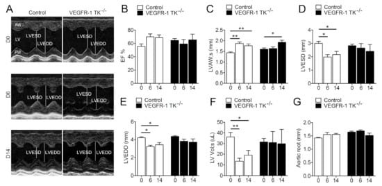 Several publications have shown that VEGFR-1 ligands VEGF-A and VEGF-B in the heart induce LVH and angiogenesis as well as regulate cardiac function [,,]. To test whether VEGFR-1 signaling is involved in these processes, we studied cardiac function at baseline and during pressure overload using domain–specific knockout mouse lacking the intracellular VEGFR-1 tyrosine kinase domain (TK−/−). First, we performed baseline cardiac function analysis (day 0) with high-resolution transthoracic echocardiography for five-to-seven-month-old VEGFR-1 TK−/− mice and their littermate control mice. Both groups displayed similar cardiac parameters indicating that VEGFR-1 TK activity is not required for normal cardiac function at resting conditions (Figure 1A–F).