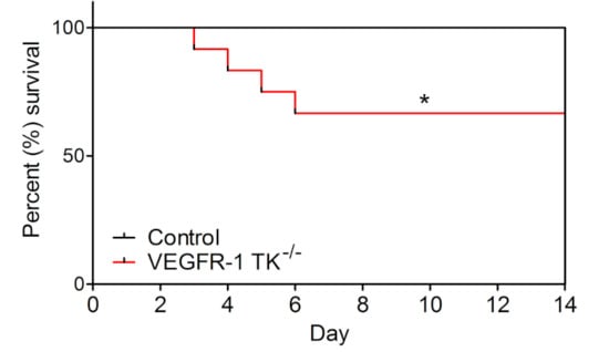- Hiratsuka, S.; Minowa, O.; Kuno, J.; Noda, T.; Shibuya, M. Flt-1 lacking the tyrosine kinase domain is sufficient for normal development and angiogenesis in mice. Proc. Natl. Acad. Sci. USA 1998, 95, 9349–9354. [Google Scholar] [CrossRef]