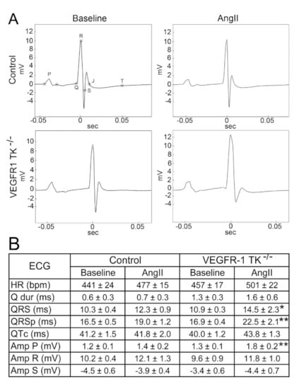 We acquired surface ECG signal during echocardiographic imaging and were able to show that, at day 14, LVH induces a significant prolongation in ventricular depolarisation of VEGFR-1 TK−/− mice, which is seen as widening of the QRS complex by 25% (Figure 3A,B). Additionally, QRSp duration was also prolonged by 25% representing an increase in ventricular depolarisation and early repolarisation. There were no significant changes in R or S waves; however, both groups exhibited some changes in J wave, including widening and lowering of J wave. The amplitude of P wave was increased in VEGFR-1 TK−/− mice, suggesting atrial dilatation. No arrhythmias were detected during the ECG recordings.