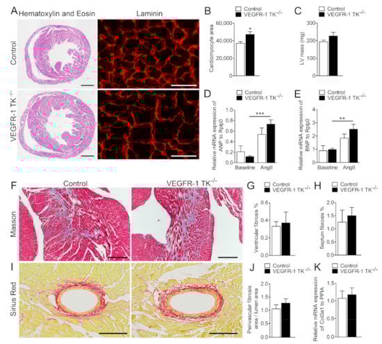 ANP and BNP secretion from the heart is increased during hemodynamic overload and cardiac remodelling both in humans and in experimental animal models []. ANP and BNP levels were increased after angII infusion, in particular in VEGFR-1 TK KO mice, suggesting cardiac dysfunction (Figure 4D,E). Cardiac fibrosis is a key pathological process in LVH and cardiac dysfunction, and it can be seen as diffuse, disproportionate accumulation of collagen in the myocardial interstitium. Interstitial fibrosis was graded from Masson’s trichrome and perivascular fibrosis from Sirius Red-stained sections, but no significant differences in collagen deposition in VEGFR-1 TK−/− and control mice were observed, and in addition Col3a1 mRNA levels were similar in both groups (Figure 4F–K).