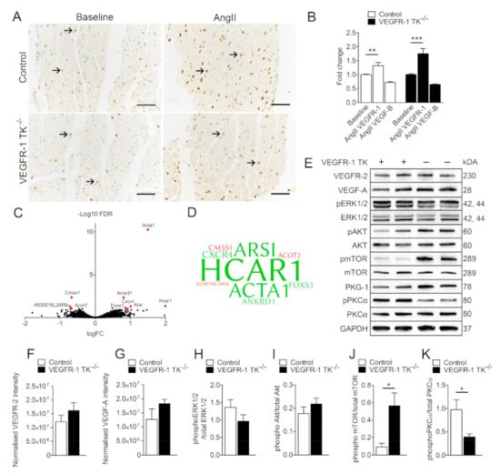 LVH increases VEGFR-1 expression in the myocardium. (A) Representative images of VEGFR-1 staining of the myocardium at baseline and after 14-day angII infusion. (B) Relative VEGFR-1 and VEGF-B expression measured with RT qPCR (n = 5–7/group). (C) RNA sequencing of LVs at day 14 of angII infusion. Volcano plot in which red represents significance in VEGFR-1 TK−/− mice compared to littermate controls with the use of a log fold change (logFC) >0.585 and false discovery rate (FDR) value of <0.10 (n = 4/group). (D) Word cloud presentation of differentially regulated genes found in RNA sequencing. Upregulated genes are marked with green and downregulated genes with a red colour. Larger word size correlates with higher fold change (n = 4/group). (E) Western blot analysis of LVH signaling cascades at day 14 of angII infusion. Quantification of VEGFR-2 (F), VEGF-A (G) phosphorylated ERK1/2 (H), Akt (I), mTOR (J) and PKCα (K) expression in LVs (n = 4–5/group). Values are mean ± SEM. Statistical analyses were performed using one-way ANOVA and Student’s t-test. *** p < 0.001; **p < 0.01; * p < 0.05.
