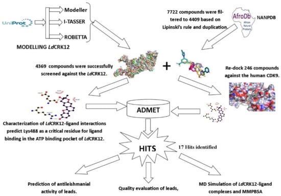 A schematic pipeline detailing the step-by-step techniques employed in the study is described in Figure 1. After modelling and validating the 3D structure of the LdCRK12, structure-based virtual screening (SBVS) was performed to identify compounds with high binding affinity to the LdCRK12 protein. Additionally, the selected hits were docked against the human cyclin-dependent kinase 9 (CDK9) since it is a homologue of the kinase domain of the LdCRK12. Molecular interactions between the receptors and the compounds were investigated using MD studies including MM/PBSA. Chemical absorption, distribution, metabolism, excretion, and toxicity (ADMET) predictions were performed to evaluate the toxicity of the compounds. Thereafter, the biological activity of identified biomolecules was predicted using machine learning-based Open Bayesian techniques [27,28].