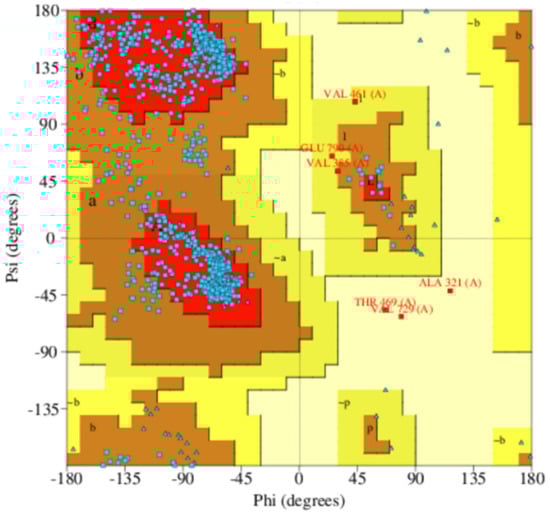 The Ramachandran plots of all the three shortlisted models were obtained using PROCHECK which evaluates the stereochemistry of protein models by determining residue-by-residue geometry and overall structure geometry [44]. A protein structure is considered as quality based on the percentage of residues in the most favored (core), additionally allowed, generously allowed, and disallowed regions [73]. Protein structure MOD5 had 79.7%, 15.5%, 3.0%, and 1.8% of residues in the most favored, additionally allowed, generously allowed, and disallowed regions, respectively (Table 6 and Figure S2A). ITAS5 was also predicted to have 61.0%, 29.8%, 5.9%, and 3.3% of residues in the most favored, additionally allowed, generously allowed, and disallowed regions, respectively (Table 6 and Figure S2B). For the ROB1 structure, 82% of the amino acid residues were present in the most favored region, 17.1% residues were found in the additionally allowed regions, 0.4% of residues were in the generously allowed regions, and 0.4% in the disallowed region (Table 6 and Figure 3). The Ramachandran plots revealed that the model ROB1 had the most reasonably good structure (Table 6, and Figure 3 and Figure S2A,B).