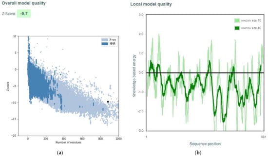 The quality of the generated models was assessed via SAVESv5.0 (http://servicesn.mbi.ucla.edu/SAVES/; accessed on 9 March 2020) along with Ramachandra plots from PROCHECK (https://www.ebi.ac.uk/thornton-srv/databases/pdbsum/Generate.html; accessed on 6 February 2021) [44]. The z-score obtained from ProSA-web [45,46], an indication of the overall model quality of the structures, was also determined. The z-score determines whether the input model is of X-ray or NMR quality. The local model quality of the structures was also determined by plotting the energies as a function of protein residue position. The positive values signify problematic or erroneous parts of the input structure. The reasonably best structure was selected based on the quality assessments performed.