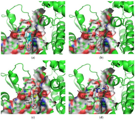 ZINC000095485940 interacted with the LdCRK12 via hydrogen bonds with Gly468, Ser569 and Asp626 of bond lengths 2.93, 2.95 and 2.70 Å, respectively (Figure 6a and Figure S3A, and Table 8). ZINC000095485940 also formed hydrophobic contacts with Leu465, Ser466, Thr469, Val473, Ala486, Lys488, Ser544, Phe563, Asp612, Asn613, Leu615, and Thr625 (Figure 6a and Figure S3A, and Table 8). NANPDB1406 interacted with Lys488, Ala566, and Ser569 via hydrogen bonds and also formed hydrophobic bonds with Leu465, Ser466, Gly468, Val473, Ala486, Tyr565, Thr567, Ala568, Asp612, Leu615, and Asp626 (Figure 6b and Figure S3B, and Table 8). NANPDB2581 formed a hydrogen bond with Lys610 with a bond length of 3.08 Å and hydrophobic contacts with Leu465, Ser466, Thr469, Tyr470, Ala568, Ser569, Asp612, Asn613, Leu615, and Asp626 (Figure 6c and Figure S3C, and Table 8). NANPDB6446 also interacted with the LdCRK12 via hydrogen bonds with Ser569 and Arg575, and hydrophobic bonds with Leu465, Ser466, Ala568, Gly572, Asp612, and Asp626. The formation of multiple hydrogen bonds between an enzyme and a molecule influences the activity of the compound [79]. Leu465, Ser466, Thr469, Ala486, Ala568, Ser569, Asp612, Asn613, Leu615, and Asp626 are predicted as critical residues for ligand binding in the ATP binding pocket.