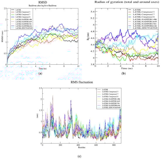 Among the known inhibitors, the compound 8 and TQ6 demonstrated the least binding energy of −9.1 kcal/mol to the LdCRK12. Compound 8 was reported to inhibit the Leishmania parasite with EC50 values of 0.025 µM and 0.075 µM in the axenic and intra-macrophage assays, respectively. GSK3186899, paromomycin, and compound 5 also had binding energies of −8.5, −7.9, and −7.2 kcal/mol, respectively (Table 8). These three compounds demonstrated binding energies lower than the −7.0 kcal/mol threshold defined for AutoDock users [55]. This implies that these compounds have the potential to demonstrate significant inhibitory activities against the parasite as exhibited by compounds 5 and 7 previously [20]. Miltefosine demonstrated the highest binding energy of −5.0 kcal/mol to the LdCRK12 (Table S1).