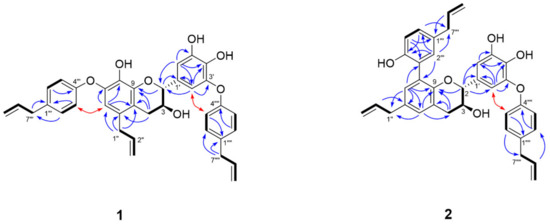 1H-1H COSY (thick black line), key HMBC (blue arrow), and ROESY (red arrow) correlations of compounds 1 and 2.