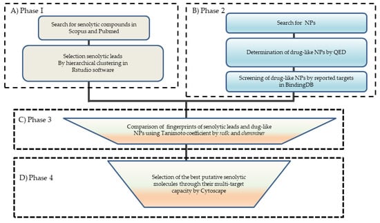 The workflow of the methodology for identifying putative senolytic molecules. (A) Phase 1: Creating a senolytic lead dataset from Pubmed and Scopus databases from the information obtained up to September 2020. The leads were determined by hierarchical structural clustering using the complexheatmap (K-means) with R-Studio through their molecular descriptors. (B) Phase 2: Selection of drug-like natural products (NPs) from the BIOFACQUIM and Inflamnat datasets based on the Quantitative Estimate of Drug-likeness (QED). The molecules were searched in the Pubchem server to obtain their structural information. Data filtering of NPs to obtain drug-like molecules by QED was searched for the reported targets in BindingDB. (C) Phase 3: Selection of putative senolytic compounds based on a comparison of the fingerprints of the drug-like NPs and senolytic leads employing the Tanimoto coefficient and the Silhouette clustering (used to corroborate the drug-like molecules from NPs). (D) Phase 4: Selection of the best putative senolytic molecules by creating networks with Compound Spring Embedder (CoSE) layout using Cytoscape software. The selected drug-like molecules, their pharmacological targets, and the network that contained targets involved in senescence were used in order to construct a compound-target senescence network.