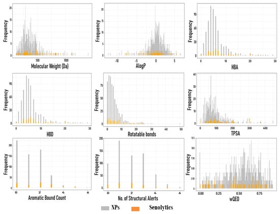 Distribution of molecular descriptors for senolytic compounds and NPs: molecular weight (Da), Ghose-Crippen-Viswanadhan octanol-water partition coefficient (AlogP), the number of H-acceptors (HBA), the number of H-donors (HBD), the number of rotatable bonds, total polar surface area (TPSA), aromatic bond count, and Quantitative Estimate of Drug-likeness (wQED). Vertical lines represent frequency values, while horizontal lines represent the intervals of the data. The abscissa axis represents the calculated values for each compound and each molecular descriptor, and the ordinate axis represents the frequency of the values. NPs (n = 562) and senolytic compounds (n = 79).