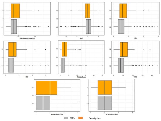 Boxplots showing the distribution and summary statistics of the molecular descriptors of NPs and senolytic compounds: molecular weight range (Da), Ghose-Crippen-Viswanadhan octanol-water partition coefficient (AlogP), the number of H-acceptors (HBA), the number of H-donors (HBD), the number of rotatable bonds, total polar surface area (TPSA), aromatic bond count of senolytic compounds and NPs. The abscissa axis represents the calculated values for each compound and each molecular descriptor, and the ordinate axis represents the frequency of the values. NPs (n = 562) and senolytic compounds (n = 79).