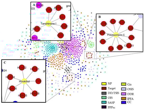 We obtained a compound-target network (Figure 6) related to senescence that shows 861 nodes and 1227 edges (or links), where 17 nodes represent the drug-like molecules obtained by QED analysis. It should be noted that three molecules have the most significant number of targets involved in any of the senescence pathways used. These putative senolytic molecules are represented in Figure 6 as yellow nodes and their cellular targets as red nodes. The putative senolytic molecule hinokitiol showed a connection to the senescence network through the inhibition of histone deacetylase 4 and 5 (HDCA4 and 5) [57], targets involved in the cell cycle (CC). Preussomerin C inhibits JUN protein, a target involved in oxidative stress-induced senescence (OSIS) [58], and tanshinone I modulates the target RAD51, which is involved in DNA damage response (DDR) [59] (Figure 6). Table 3 summarizes the main characteristics of these putative senolytic compounds obtained from this analysis.