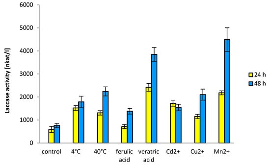 Effect of temperature, ferulic and veratric acids, Cu, Mn, and Cd ions on enzymatic activities of laccase after 24 and 48 h after induction of C. unicolor. Error bars represent the standard deviation of the mean ± SD for three independent measurements (n = 3).
