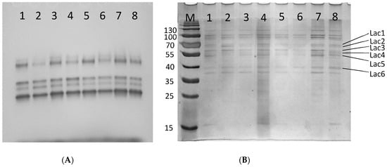 Laccase activity staining (A) and SDS-PAGE profile (B) of proteins found in the post-culture liquid of C. unicolor; 1, control (no induction); 2, 4 °C; 3, 40 °C; 4, ferulic acid; 5, veratric acid; 6, Cd; 7, Cu; 8, Mn; laccase bands are indicated.