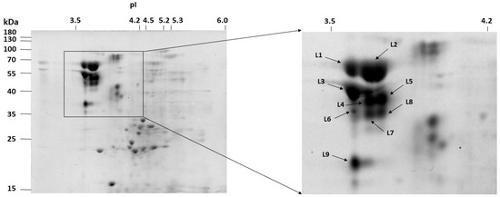 The 2D-gel separation of extracellular protein from the 8-day-old C. unicolor culture. Spots corresponding to the identified laccase enzymes are designated from L1 to L9.