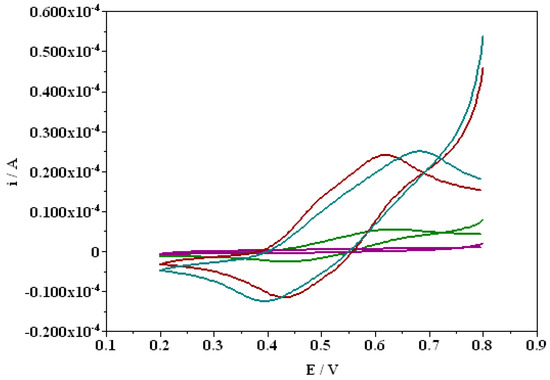 Electrochemical characterization of purified laccase isolated from C. unicolor after incubation with endogenous aspartic-like protease. Aspartic-like protease (violet line); laccase + ABTS (green line), after incubation time of 60 min (red line) and after 120 min (blue line).