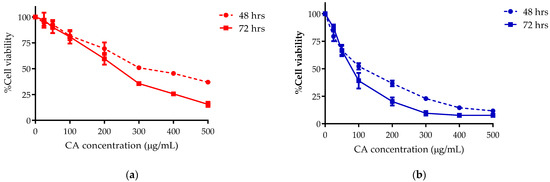 The cell viability of (a) KKU-100 and (b) KKU-213 after CA treatment for 48 and 72 h; data represents the mean ± standard deviation of three independent experiments.