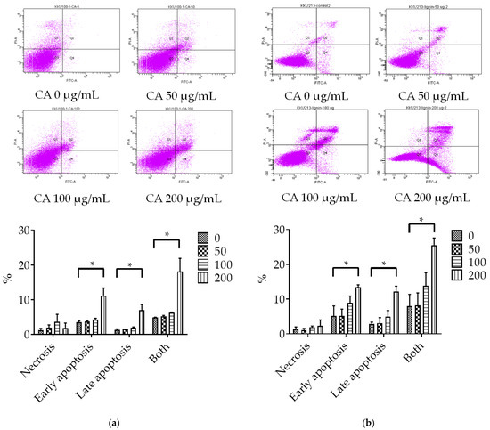 Flow cytometric analysis of apoptotic cells of (a) KKU-100 and (b) KKU-213 cell lines stained with propidium iodide and FITC-Annexin V after treatment with CA for 48 h. (Data was presented in triplicate.* = statistically significant; p-value < 0.05).