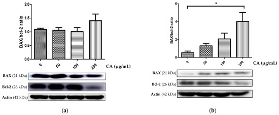 BAX and Bcl-2 protein expression of (a) KKU-100 and (b) KKU-213 after treatment with CA for 48 h. (* = statistically significant; p-value < 0.05).