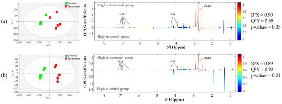 OPLS-DA scores and loading plots displaying significant extracellular metabolites after treatment with or without 200 µg/mL CA on (a) KKU-100 and (b) KKU-213 cell lines. The positive peaks of the OPLS-DA loading plot indicate metabolites higher in the treatment group, whereas the negative peaks represent metabolites higher in the control group. The color of the peaks corresponds to the correlation coefficients in the discrimination model.