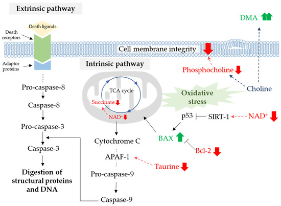 The apoptotic pathways and their relevant metabolites. The red arrow represents a decreased level and the green arrow an increased level compared to the control.