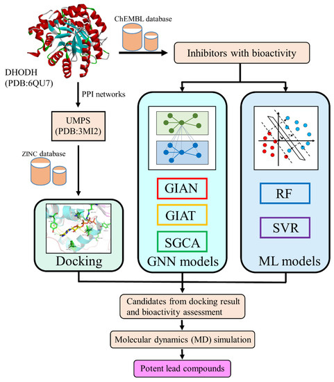 This article focuses on the DHODH protein and its related target, the UMPS protein, identified via network pharmacology in order to screen potential lead compounds from small molecular databases. Here, we introduce several composite architectures of GNN (GIAN, GIAT, and SGCA) and two machine learning methods (RF and SVR (support vector regression)) for the prediction of molecular biological activity. The docking results, GNN models, and machine learning could help us to identify the most promising lead compounds. The flowchart of our study is shown in