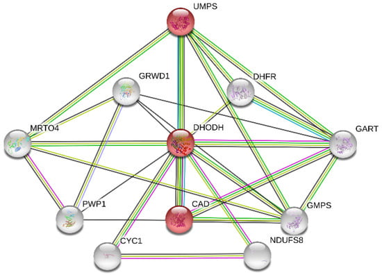 Figure 7) in the pyrimidine metabolism pathway containing mainly three proteins, DHODH, CAD, and UMPS, plays a significant role in the de novo pyrimidine synthesis. As mentioned above, inhibiting the DHODH protein or the pyrimidine biosynthesis is able to regulate the abnormal cell proliferation and metabolism, so it achieves the anticancer effect. In addition, the combined score between DHODH and UMPS was 0.99, which indicates that drugs acting on them at the same time may have a greater effect. Therefore, two proteins, DHODH and UMPS, which should be inhibited, were focused on as potential targets in this research.