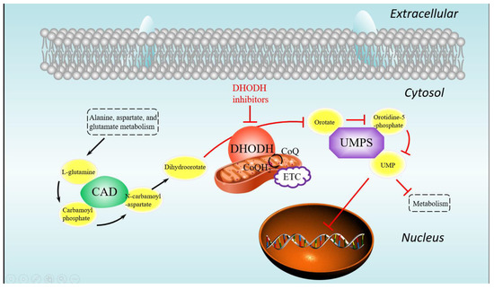 17]. Several related target proteins, such as uridine 5’-monophosphate synthase (UMPS) and CAD protein, which are downstream and upstream of DHODH, respectively, on the pyrimidine biosynthesis pathway, should be focused on as well [