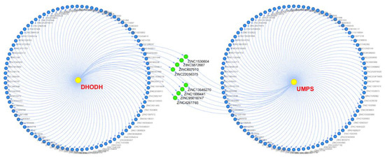 Figure 8). The blue points denote the different compounds of the corresponding proteins, the yellow points denote the target proteins, and the green points expressed specially in the middle denote the potential multitarget compounds. The results show that several molecules were associated with DHODH and also relevant to UMPS. Therefore, based on the interaction between two proteins and the docking results, we believe that it was credible to focus our drug selection on them.