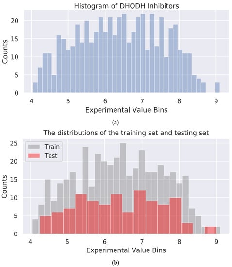 Three multi-GNN models were constructed based on 532 compounds containing the SMILES information and their biological activity values. The dataset was randomly split with the ratio of train/test at 8:2. The histogram of DHODH inhibitors and the distributions of the training set and testing set are shown in