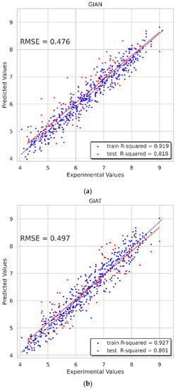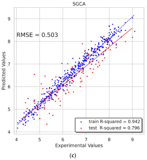 Figure 10. The RMSE of the GIAN model on test sets was 0.476, and the R-squared on the training and test sets reached 0.919 and 0.818, respectively. As for the GIAT model, the RMSE on the test sets was 0.497, and the R-squared on the training and test sets reached 0.927 and 0.801, respectively. The R-squareds of the SGCA model on the training and test sets were 0.942 and 0.796, respectively, and the RMSE was 0.503. The performances of these models were satisfying and inspiring.