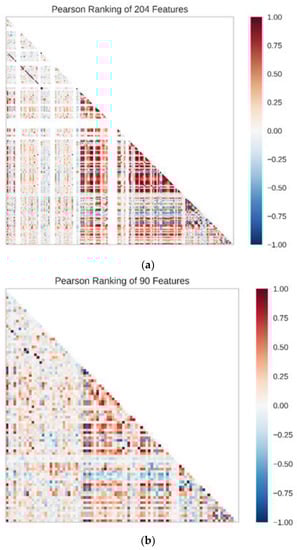 The Pearson correlation coefficients of 204 features were first to be calculated to figure out the correlation between features before building the predicting model. Additionally, the Pearson rankings of 204 features indicated that some of the features had a high correlation, with correlation coefficients greater than 0.4 (
