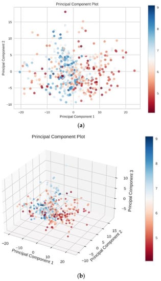 Figure 11a). We used principal component analysis (PCA) to reduce the dimensionality of our dataset while maintaining the features of the dataset that contribute the most to each other by retaining the lower-order principal components and ignoring the higher-order principal components. The 2D and 3D principal component plots displayed the result of dimensionality reduction (