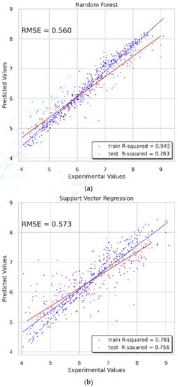 Figure 11b). In this process, we found that the smaller number of features would not lead to a better predicting effect. We believe the reason is that our dataset was relatively large, and the number of features was small, which may easily lead to indistinguishable features and data overlap. The same preprocessing step was used for the RF model and SVR model. Finally, the known experimental activity values and the predicted activity values of our dataset were used for calculating the correlation coefficient (