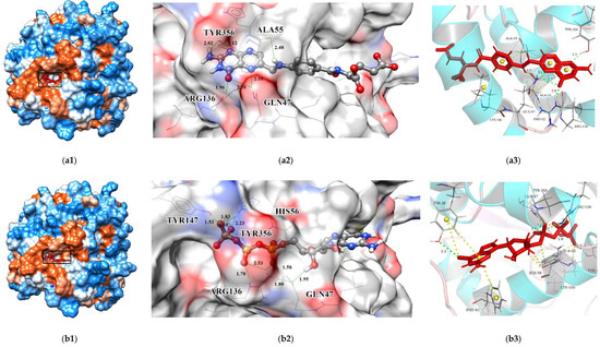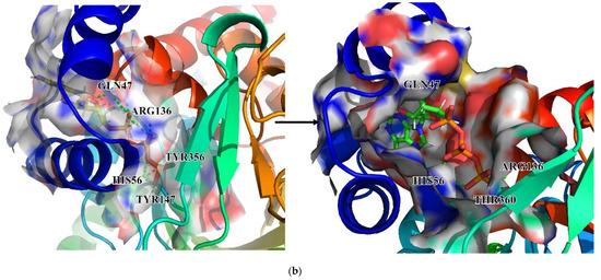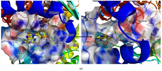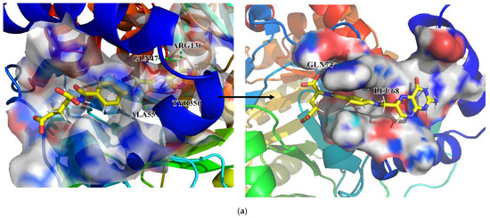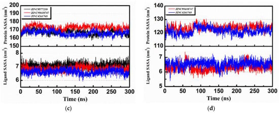 Figure 17a, black), the low ligand MSD values also showed good affinity of the ligands staying with protein complexes. This might be caused by the poor binding capacity of ZINC8577218 with some residues of protein so that the ligand would have a relatively higher displacement. SASA analysis provided information about the hydrophilic and hydrophobic abilities of the system. The SASA values of both proteins and ligands changed little during the MD period, and there were no significant differences in hydrophilicity and hydrophobicity.