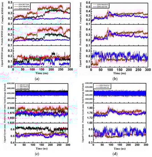 Figure 16c, red), indicating that their protein structures were relatively loose and less stable. The other gyrate value curves (including protein and ligand) were relatively flat, which was consistent with the RMSD analysis.
