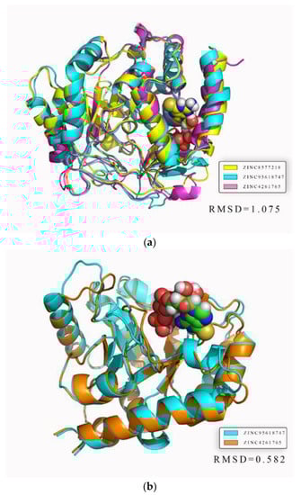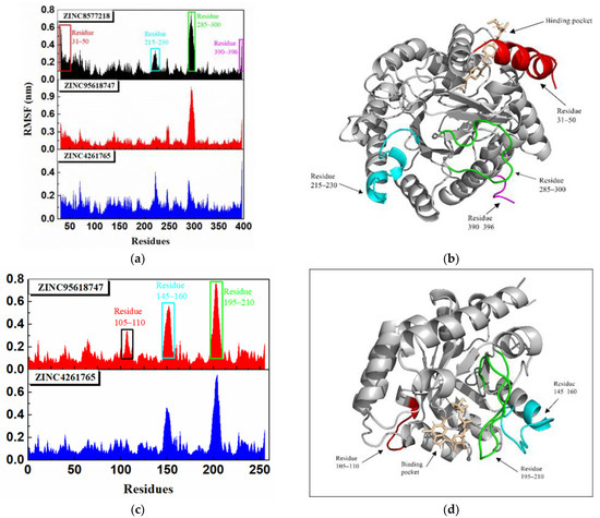 Figure 16a, red), respectively, which suggests that the interactions changed in the conformation. They both tended to stabilize after the fluctuations. The trend of the protein RMSD value was similar to that of the complex RMSD value. Moreover, in general, the ligand RMSD tended toward a stable range over time, although it rose at some time. As for the UMPS protein, both ZINC95618747 (