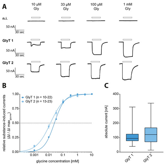 Figure 2. Functional analysis of glycine transporters (GlyTs) with glycine-induced dose-dependent current responses. (A) Representative current traces of original electrophysiological recordings from Xenopus laevis oocytes expressing GlyT1 or GlyT2, compared to non-injected oocytes after superfusion with glycine solution in increasing concentrations. Substance application is indicated by open box above the trace. (B) Dose–response curves of GlyTs showing the glycine-induced currents in relation to the maximum observed current induced by 10 mM glycine (GlyT1 n = 10–22, GlyT2 n = 13–23). (C) Maximum glycine-induced current amplitudes (nA) determined on oocytes expressing transporter individually taken together from all measurements (GlyT1 n = 148; GlyT2 n = 130; data presented as boxplots).