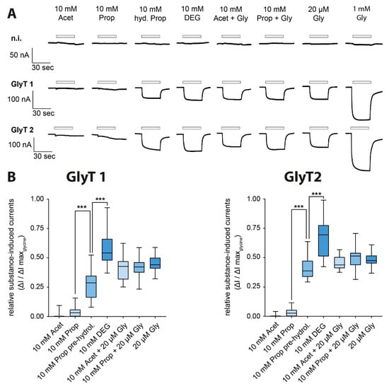 Figure 6. Current response of GlyRα1-3 after DEG application with and without glycine. (A) Original traces of electrophysiological measurements in Xenopus laevis oocytes expressing GlyRα1-3 individually after superfusion with DEG solution in increasing substance concentration (100 µM, 333 µM, 1 mM, 3.3 mM, 10 mM), sarcosine solution (1 mM) and glycine solution (1 mM) and after superfusion with different glycine solutions (20 µM, 200 µM, 2 mM) additionally containing amounts of DEG (0 mM, 3.3 mM, 10 mM). (B) Relative substance-induced currents of GlyRα1-3-expressing oocytes in relation to the maximum observed current induced by 2 mM glycine (GlyRα1 n = 24–37; GlyRα2 n = 14–30; GlyRα3 n = 12–29; data shown as boxplots, p < 0.001 (***), one-way ANOVA with Bonferroni post-hoc correction).