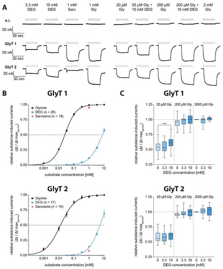 Figure 4. DEG functions as a full agonist at GlyT1 and GlyT2. (A) Representative original traces of electrophysiological measurements in Xenopus laevis oocytes expressing GlyT1 and GlyT2 individually after superfusion with DEG solution in increasing substance concentration (100 µM, 333 µM, 1 mM, 3.3 mM, 10 mM), sarcosine solution (1 mM) and glycine solution (1 mM) and after superfusion with different glycine solutions (20 µM, 200 µM, 2 mM) additionally containing distinct amounts of DEG (0 mM, 3.3 mM, 10 mM) to create co-application conditions. (B) Dose–response curves of GlyTs showing DEG and sarcosine-induced currents in relation to the maximum observed current induced by 1 mM glycine in comparison to the construct’s glycine dose–response curve (Figure 2B) (GlyT1: DEG n = 8–26, sarcosine n = 19; GlyT2: DEG n = 17, sarcosine n = 16). (C) Relative substance-induced currents of GlyT1 and GlyT2 in relation to the maximum observed current induced by 2 mM glycine + 0 mM DEG solution (GlyT1 n = 13–23; GlyT2 n = 15–31; data shown as boxplots, p < 0.001 (***), one-way ANOVA with Bonferroni post-hoc correction).