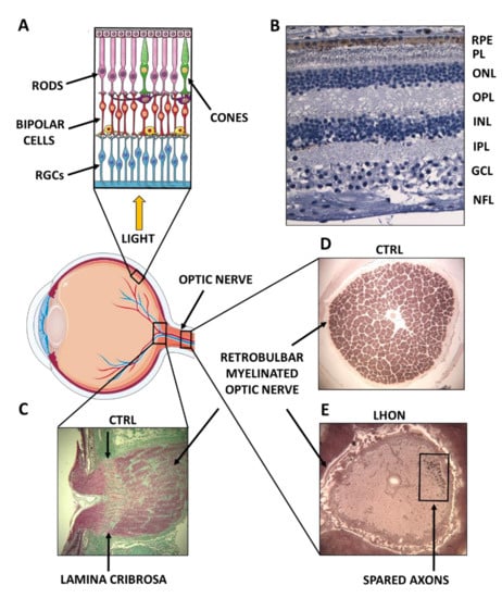 Anatomy of the human retina and optic nerve. (A) Graphical illustration of the eye, with the retina and the optic nerve highlighted. The three key retinal cell types implicated in the visual processing are indicated: photoreceptors (rods and cones), bipolar cells, and ganglion cells (RGCs). The pigment epithelium juxtaposed to photoreceptors, horizontal (purple) and amacrine (yellow) cells are also shown. (B) Histological cross-section of a normal human retina. The layers constituting the retinal tissue are indicated: retinal pigment epithelium (RPE), photoreceptors layer (PL), outer nuclear layer (ONL), outer plexiform layer (OPL), inner nuclear layer (INL), inner plexiform layer (IPL), ganglion cell layer (GCL), and nerve fiber layer (NFL). (C) Histological sagittal section of a normal optic nerve head (post-mortem). The lamina cribrosa, where unmyelinated axonal bundles are organized, is indicated, as well as the post-laminar retrobulbar myelinated optic nerve. (D) Histological cross-section of a normal optic nerve (post-mortem) is shown with myelinated bundles hosting about 1.2 million axons. (E) Histological cross-section of an optic nerve (post-mortem) from a patient severely affected by Leber Hereditary Optic Neuropathy (LHON), showing only a few spared axons. Images are a courtesy of Alfredo A. Sadun and Fred N. Ross-Cisneros from Doheny Eye Institute, UCLA, California, USA.