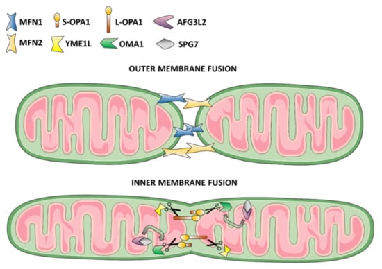 The execution of mitochondrial fusion, as mentioned above, requires the coordination of two distinct processes, the outer and inner membranes fusion. The DRPs in the outer membrane ensuring this process are Mitofusins (i.e., MFN1 and MFN2), large homologous proteins with highly similar structures: the GTPase domain, transmembrane domains that are inserted in the OMM, and two heptad repeat domains (HR1 and HR2) exposed in the cytosol that allow homotypic and heterotypic interactions between MFNs located on different mitochondria. The tethering of juxtaposing mitochondria trough trans interactions mediated by HR2 domains represents the first step of OMM fusion. Then, the GTP hydrolysis promotes MFNs conformational change mediating mitochondria-mitochondria anchoring and fusion []. Although both MFN1 and MFN2 are fusion competent proteins [,], MFN2 is less efficient in tethering mitochondria, possibly due to lower GTPase activity compared to MFN1 []. Interestingly, MFN2 is also enriched at MAMs, the ER–mitochondria interface essential for efficient mitochondrial Ca2+ uptake and lipids transfer between the two organelles [,,,].