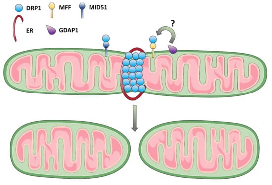 A crucial event for mitochondrial fission is the recruitment of the cytosolic GTPase Dynamin-related protein 1 (DRP1) on the OMM and its oligomerization to form a constriction ring []. DRP1 is a highly conserved protein presenting four domains: the N-terminal GTPase domain, the middle domain, the variable domain, and the GTPase effector domain in C-terminal []. The absence of phospholipids-binding domains in DRP1 structure implies that its localization on the OMM requires adaptors proteins: the mitochondrial fission factor (MFF), the mitochondrial dynamics proteins of 49 kDa (MID49) and 51 kDa (MID51), and the Mitochondrial Fission 1 Protein (FIS1) [], although a direct role for the latter as DRP1-receptor in mammals is still ambiguous []. DRP1 localizes on the OMM in specific areas, where ER and actin had previously wrapped the membrane generating pre-constriction sites [,]. This process allows the narrowing of the mitochondrial diameter and the formation of a DRP1-oligomeric ring-like structure surrounding the mitochondrion and enhancing the membrane constriction through GTP hydrolysis []. Remarkably, the ER-mitochondria contacts, which will determine the future scission sites, co-localize with replicating mtDNA nucleoids, thus ensuring the segregation of mtDNA in the newly formed mitochondria [,]. The ER-bound inverted-formin 2 (INF2) and the mitochondrial anchored formin-binding Spire1C cooperate to promote actin assembly at the ER-mitochondria contact sites, required for mitochondrial constriction [,,]. Other proteins regulating the actin cytoskeleton are involved in this mechanism, including Myosin IIA, cofilin, cortactin, and Septin 2 [,,,]. Although DRP1 is essential for the first phases of mitochondrial fission, it may be not able to complete the scission of the mitochondrion [], suggesting the involvement of other proteins. Recently, it has been demonstrated that Dynamin 2 (DNM2) acts downstream of DRP1 and it may be responsible for the final step of division []. Direct actors of the IMM constriction during mitochondrial fission have not been identified yet. However, a major role may be played by Ca2+ influx from ER to mitochondria at fission sites leading to IMM constriction before DRP1 recruitment on the OMM, as demonstrated by two recent studies [,]. Interestingly, fission of IMM may be promoted by increased levels of S-OPA1, as generated by a calcium-dependent leak in mitochondrial membrane potential and consequent OMA1 activation [].