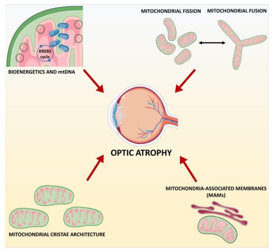 Mitochondrial diseases are the most common genetic rare disorders, even if individual syndromes may be exremely rare [,,]. Inheritance follows any of the Mendelian traits, dominant, recessive or X-linked, as over 1000 genes of the nuclear genome (nDNA) encode mitochondrial proteins, precisely 1136 according to the last version of MitoCarta 3.0 [], including a few in the X-chromosome. Amongst the many forms, Dominant Optic Atrophy Kjer’s type (DOA) is the most frequent, and over 70% of cases can be ascribed to various types of mutations affecting the Optic Atrophy 1 (OPA1) gene, encoding a key protein of the mitochondrial dynamics machinery [,,]. However, of great interest is also the multicopy circular mitochondrial DNA (mtDNA), which is exclusively maternally inherited, and follows its own genetic rules resembling those of population genetics [,,,]. The most frequent disease due to mtDNA missense mutations affecting complex I, and leading to oxidative phosphorylation (OXPHOS) deficiency, is Leber’s hereditary optic neuropathy (LHON) [,,]. As DOA and LHON are largely mono-symptomatic disorders, it must be remarked that an incredibly wide spectrum of other mitochondrial disorders including optic atrophy as defining feature, starting from the DOA “plus” [,] and LHON “plus” [,,] variants, are described and continue to be described. The last in time is the spectrum associated with dominant and recessive mutations affecting the mitochondrial single stranded binding protein (SSBP1) [,,]. Thus, within the frame of mitochondrial functions, a crossroad of many metabolic pathways, we have at least two major pathogenic mechanisms, possibly interconnected, which may lead to RGCs and their axons’ neurodegeneration: complex I-related OXPHOS dysfunction and mitochondrial dynamics [,,,,,].