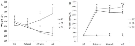 (A) Weight change during and after ET. *; Significant difference between the SH group with DT and SD groups in 4th week and AE. (B) Changes in the serum levels of glucose during six weeks ET period. *; significant difference (p < 0.001) between DT and SH groups in 2nd week, 4th week, and AE with SH group.**; significant difference (p < 0.001) between SD and SH groups in 2nd week, 4th week, and AE with SH group #; significant difference (p < 0.001) between DT and SD groups AE. Abbreviations; ET: Endurance training, BE: Before Exercise, AE: After exercise, DT: Diabetic training, SD: Sedentary diabetic, SH: Sedentary healthy. Data are expressed as mean ± SEM.