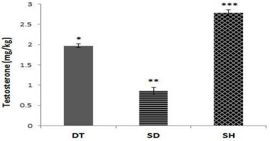 As displayed in Figure 2, the SD group showed a significantly lower testosterone levels compared to the DT and SH groups (p < 0.001). In addition, the DT group showed significantly lower testosterone levels compared to the SH group (p < 0.001) (Figure 2).