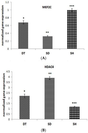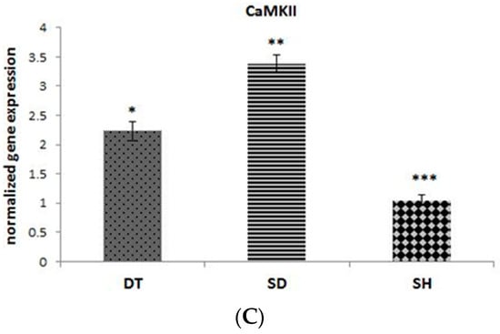 The normalized gene expression of MEF2C (A), HDAC4 (B), and CaMKII (C) at the end of six weeks ET in DT, SD, and SH groups. *; significant difference p < 0.001 between DT and SD groups, **; significant difference (p < 0.001) between SD and SH groups, ***; significant difference (p < 0.001) between DT and SH groups. Abbreviations; ET: Endurance training, DT: Diabetic training, SD: Sedentary diabetic, SH: Sedentary healthy. Data are expressed as mean ± SEM.